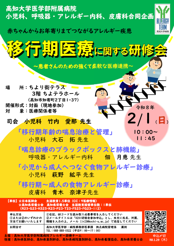 この度、高知大学医学部附属病院アレルギー診療チームでは、小児科、呼吸器・アレルギー内科、皮膚科が合同で、移行期医療に関する研修会を開催いたします。本研修会では、赤ちゃんからお年寄りまで、アレルギー疾患の患者さんが直面する移行期の課題について、各分野の専門家が、実践的な知識と技術を共有します。